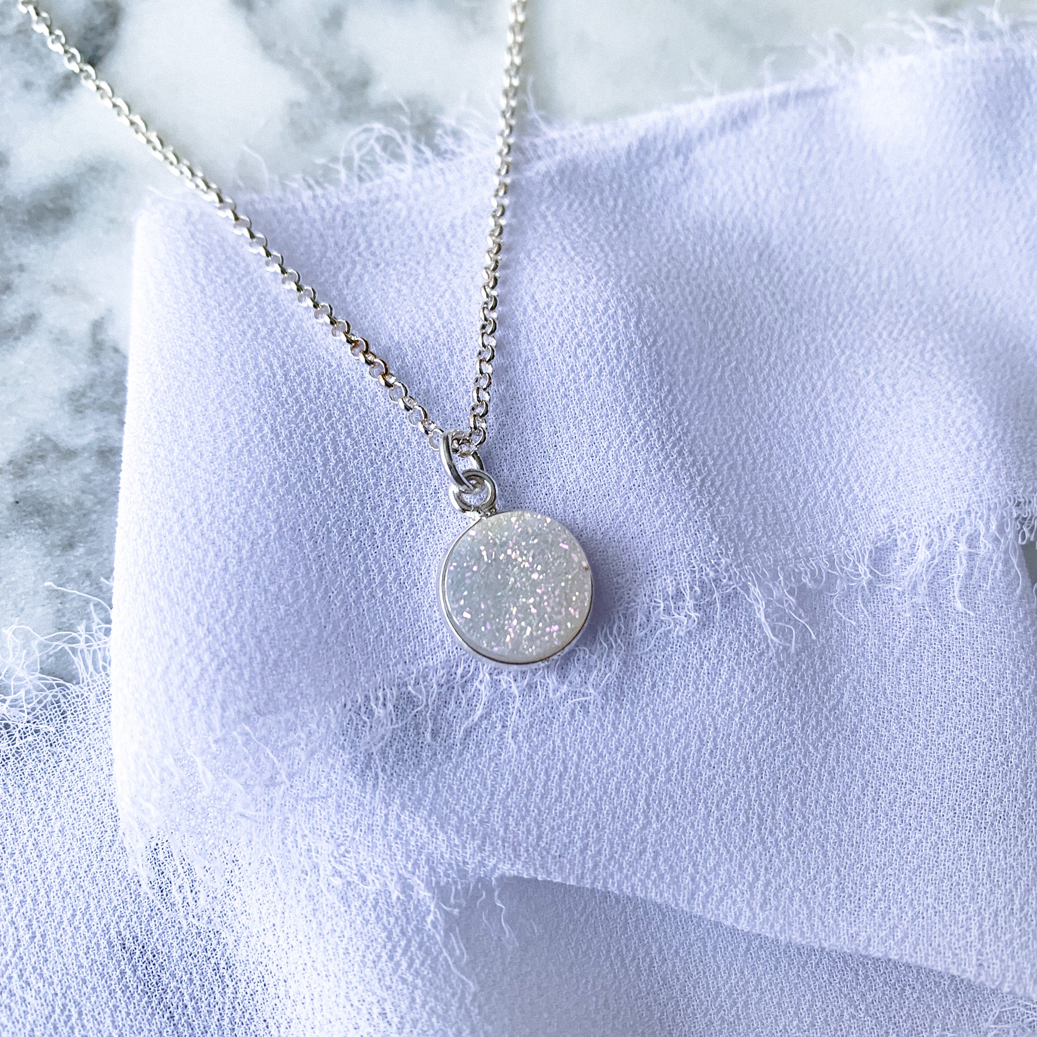 Our round druzy gemstone is edged in gold Vermeille and hangs from an 18 inch 14k gold filled chain.