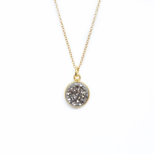 Our round druzy gemstone is edged in sterling silver and hangs from an 18 inch sterling silver chain.